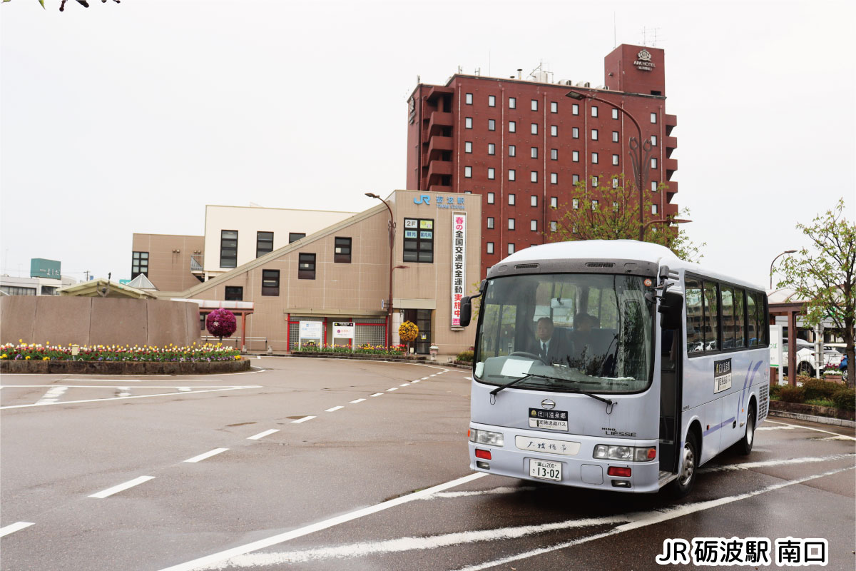15:10 JR砺波駅南口 ⇒ 人肌の宿 川金 ⇒ 庄川温泉風流味道座敷 ゆめつづり ⇒ 鳥越の宿 三楽園 ⇒ 大牧温泉観光旅館(庄川峡遊覧船 小牧港乗り場)