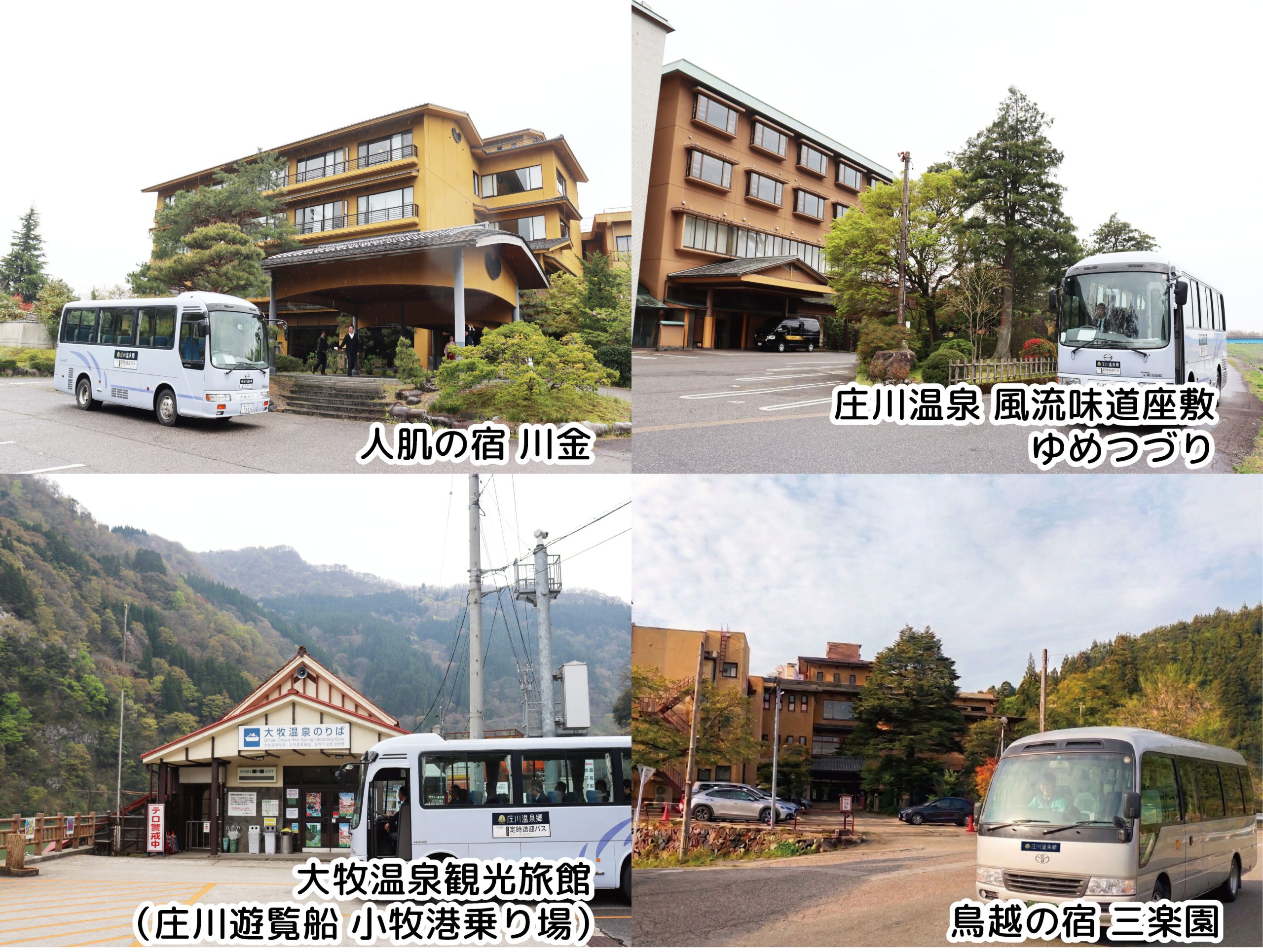 10:00 大牧温泉観光旅館(庄川峡遊覧船 小牧港乗り場)⇒ 鳥越の宿 三楽園 ⇒ 庄川温泉風流味道座敷 ゆめつづり ⇒人肌の宿 川金 ⇒JR砺波駅南口