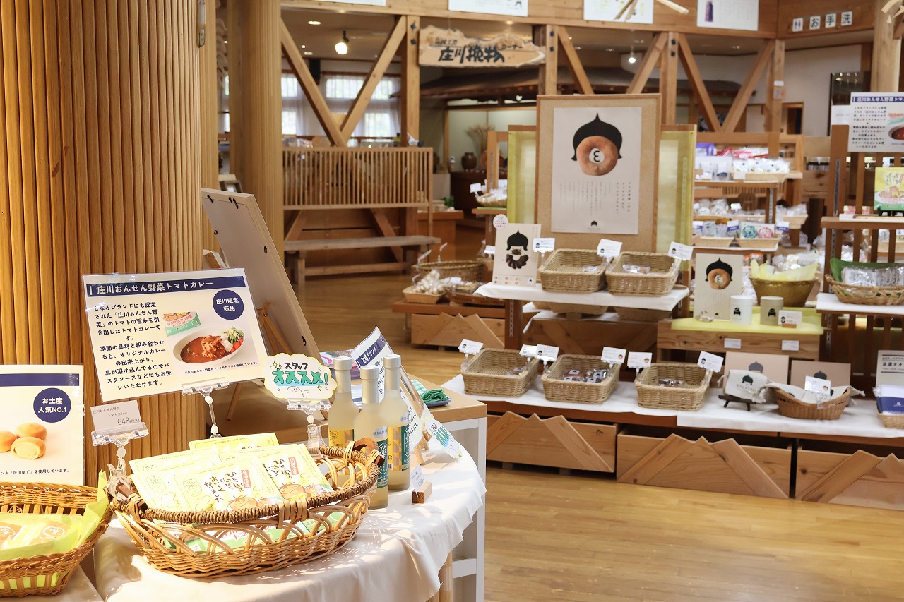 巨大水車が目印の庄川ウッドプラザでは、庄川・砺波のお土産や特産品を販売しています。