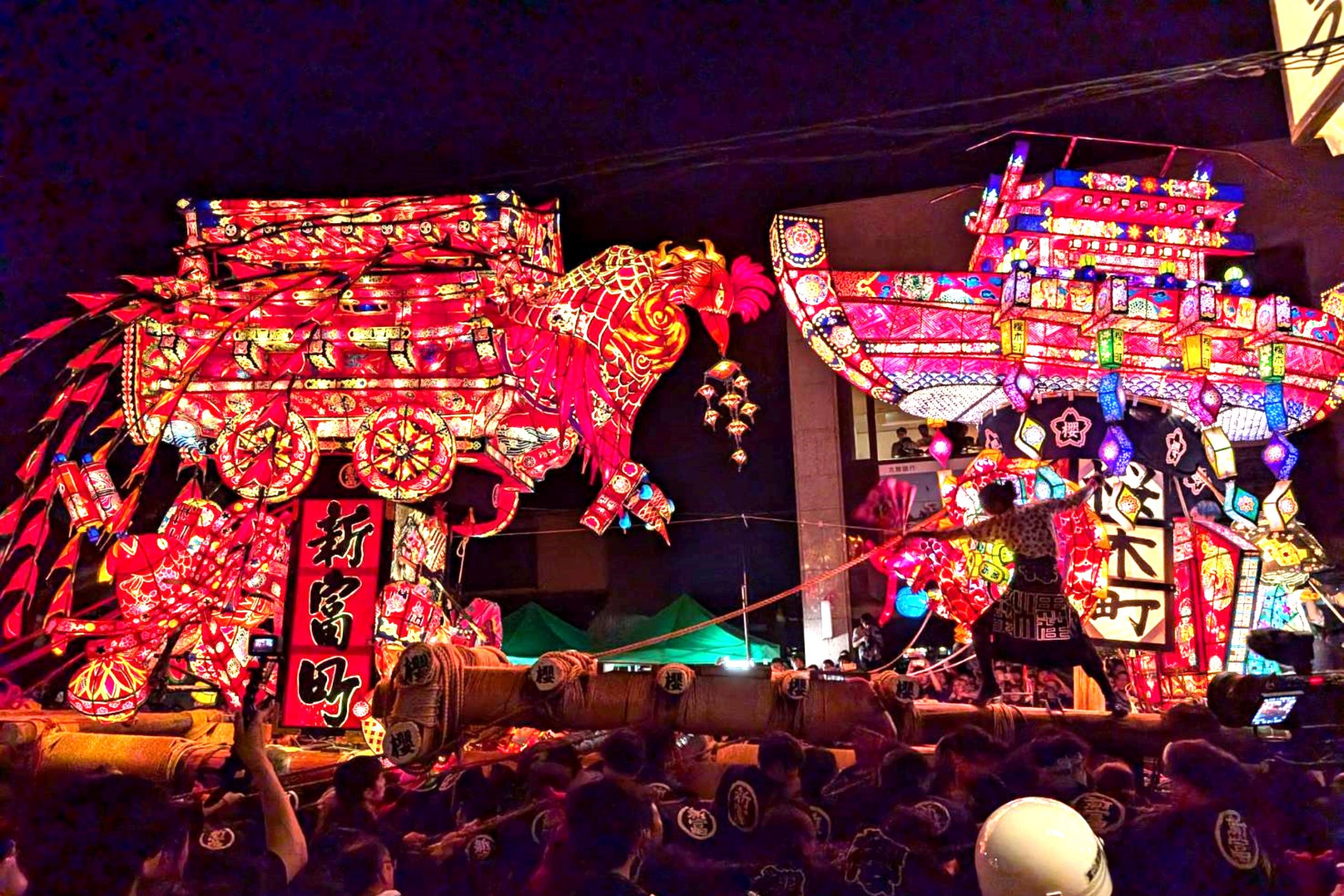 砺波市街地を中心に各地区の夜高行燈が集結し、街練りや突き合わせが行われ