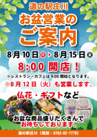 道の駅庄川はお盆期間中となる8月10日(日)~15日(金)の6日間朝8時開店となります。お盆に欠かせない切り花や今が旬の庄川おんせん野菜なトウモロコシをはじめお盆な商品盛りだくさんでお待ちしております。