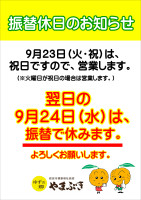 道の駅庄川の定休日は毎週火曜日となっておりますが9月23日は祝日のため、営業します。翌9月24日(水)は振替休業となります。何卒、ご理解いただきますようお願い申し上げます。