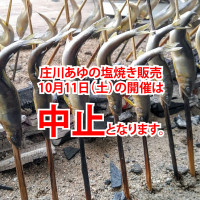 明日10月11日(土)に開催を予定していた「庄川あゆ」の塩焼き販売は雨天が予想されるため、中止となります。ご不便をおかけしますが、なにとぞご理解いただきますようお願い申し上げます。