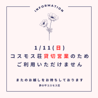 あけましておめでとうございます🎉本年もよろしくお願いいたします。1月11日(日)は貸切営業のためご利用いただけません。コスモス荘前の駐車場もご利用いただけません。ご不便をおかけいたしますが、ご理解のほど...