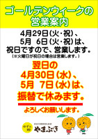 道の駅庄川はゴールデンウィーク期間中以下の営業となります。4月29日(火・祝):営業4月30日(水):振替休業5月6日(火・祝):営業5月7日(水):振替休業なお5月12日(月)は従業員研修のため臨時休業となり...