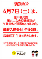 6月7日(土)交通規制のため、15時受付終了→16時閉館